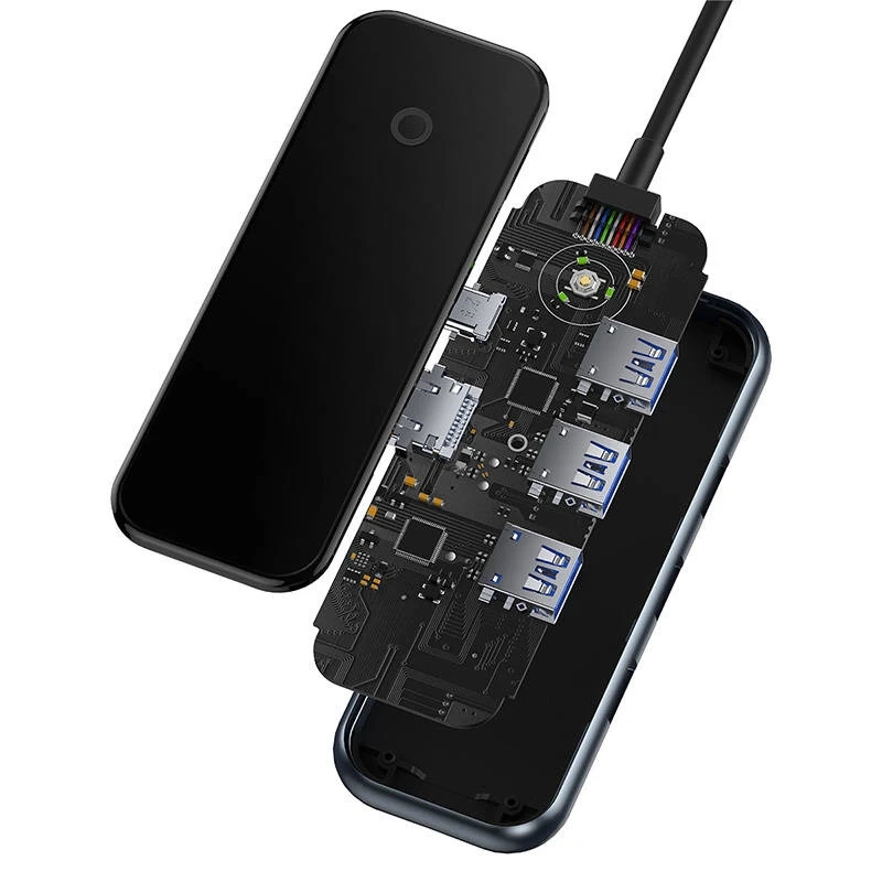 • Hub 5w1 Baseus AcmeJoy series USB-C do 2xUSB 3.0 + USB 2.0 + USB-C PD + HDMI został wyposażony w aż 5 przydatnych gniazd – 2x USB 3.0, USB 2.0, USB-C i HDMI. Umożliwia przesyłanie plików z prędkością nawet 500 MB/s.