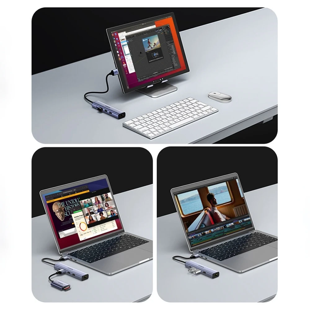 Ugreen wielofunkcyjny adapter HUB USB 3.0 - 3 x USB / Ethernet RJ-45 / USB Typ C PD szary (CM475)