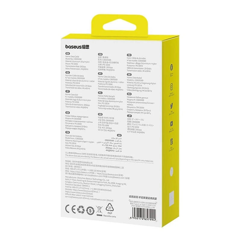 ProducentBaseusModelCrystal ShineMateriałStop aluminium + nylonowy oplotDługość1,5 mMaksymalna moc ładowania PD 100W Prędkość transmisji20 GbpsTransmisja wideo4K@60Hz