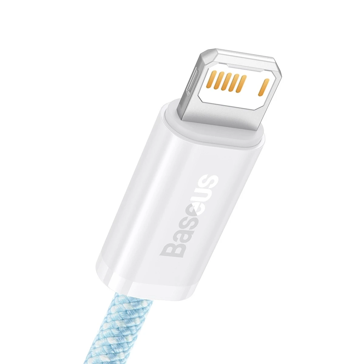 Producent Baseus Model CALD000503 Rodzaj USB do Lightning Materiał ABS + oplot o wysokiej gęstości Natężenie Do 2,4 A Prędkość transmisji Do 480 Mbps Długość 2 m Kolor Niebieski