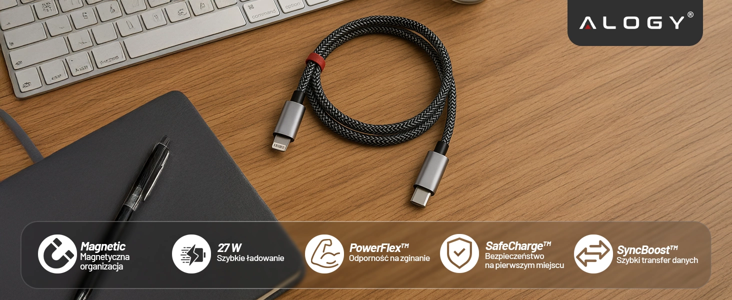 Kabel Alogy MagiCharge™ USB-C do Lightning 27W to niezastąpione akcesorium dla użytkowników iPhone’a, iPada i AirPodsów. Łączy szybkość, bezpieczeństwo i elegancki design, sprawdzając się w każdej sytuacji – od codziennego ładowania po podróże biznesowe.