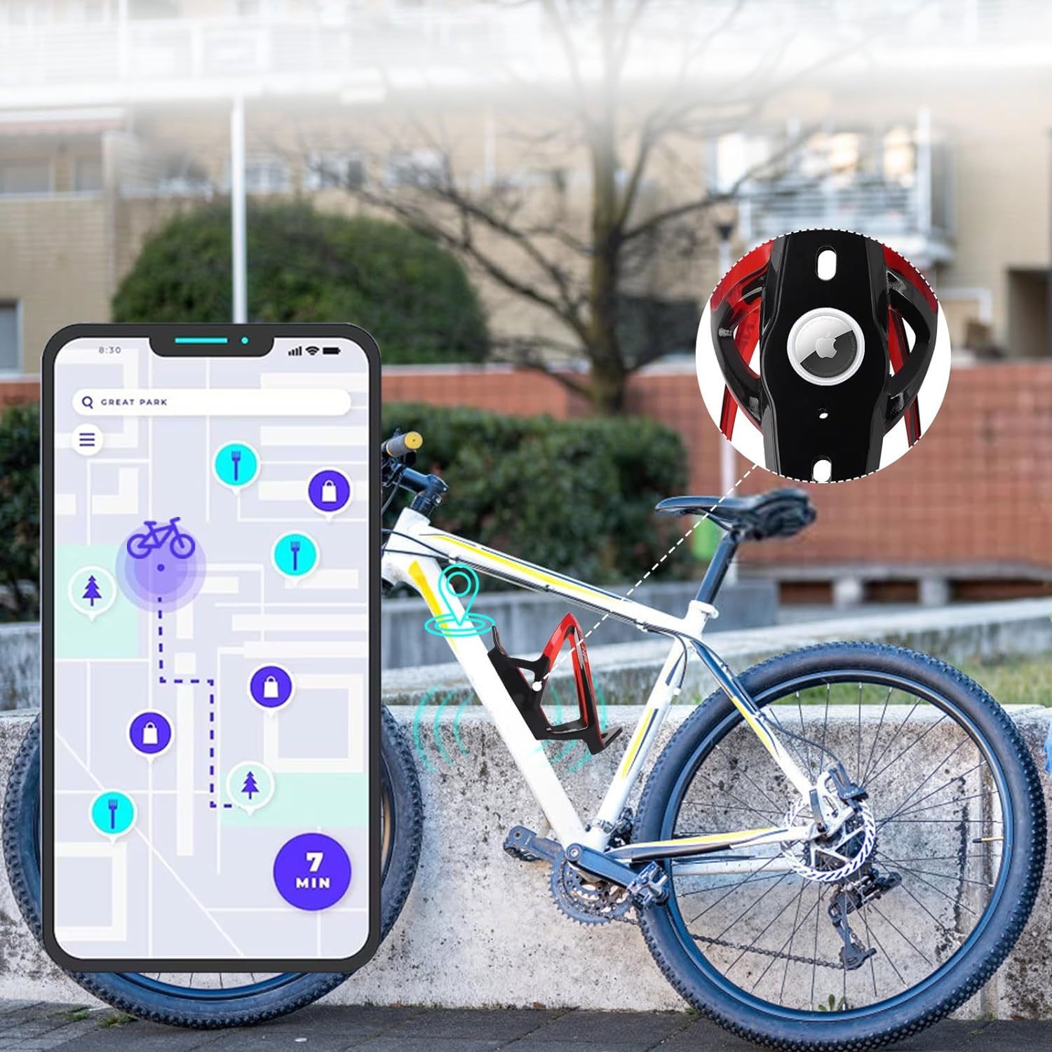 ✅ Airtag jest schowany pod specjalną osłonką, która znajduje się w wewnętrznej stronie uchwytu, dzięki czemu jest chroniony przed wypadnięciem i uszkodzeniami. Dzięki wbudowanemu miejscu na Airtag, użytkownik może monitorować lokalizację swojego roweru za pomocą aplikacji Find My na urządzeniach Apple.