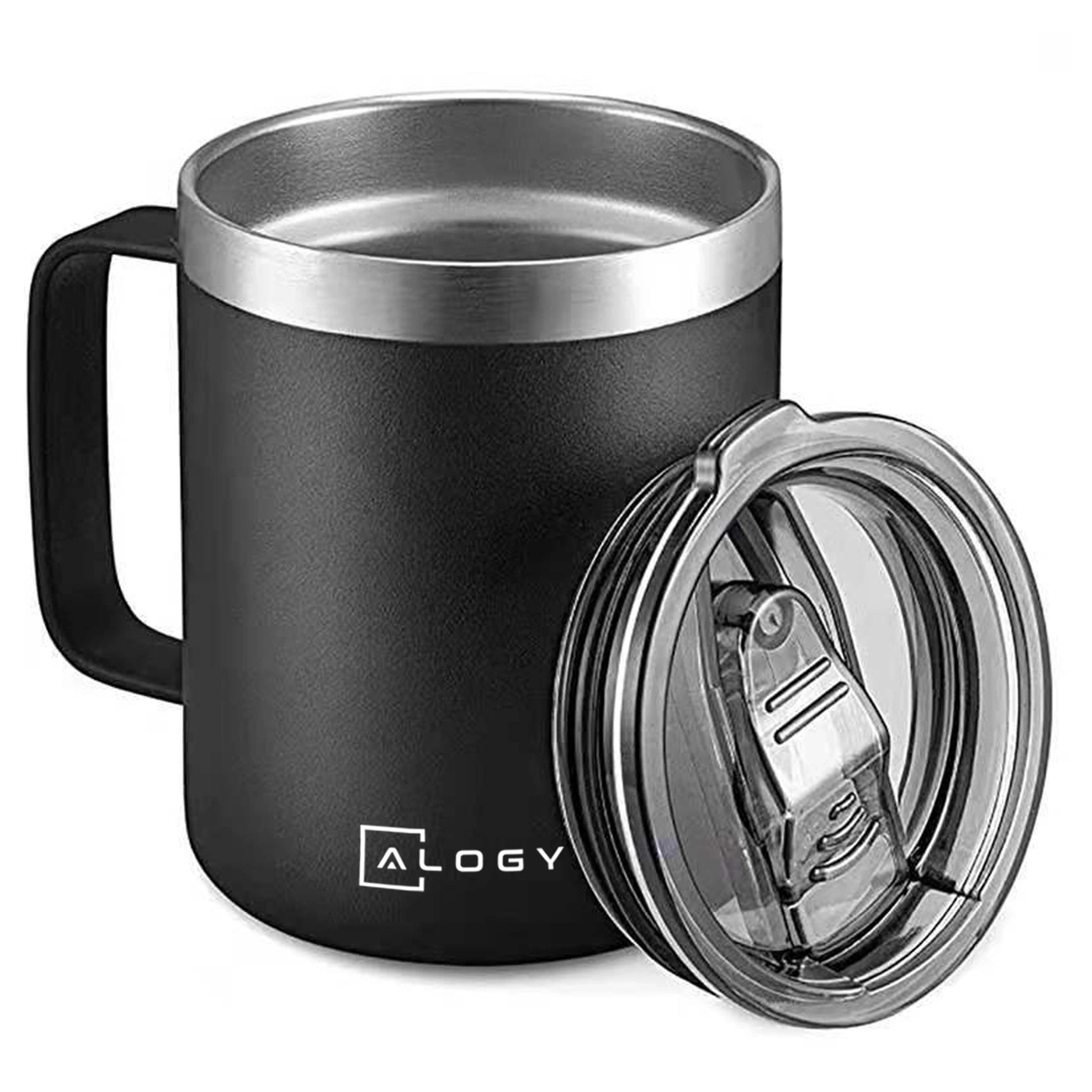 Opinie o Kubek termiczny 420ml z uchwytem pokrywką na kawę herbatę stalowy zimne i ciepłe napoje Alogy Czarny