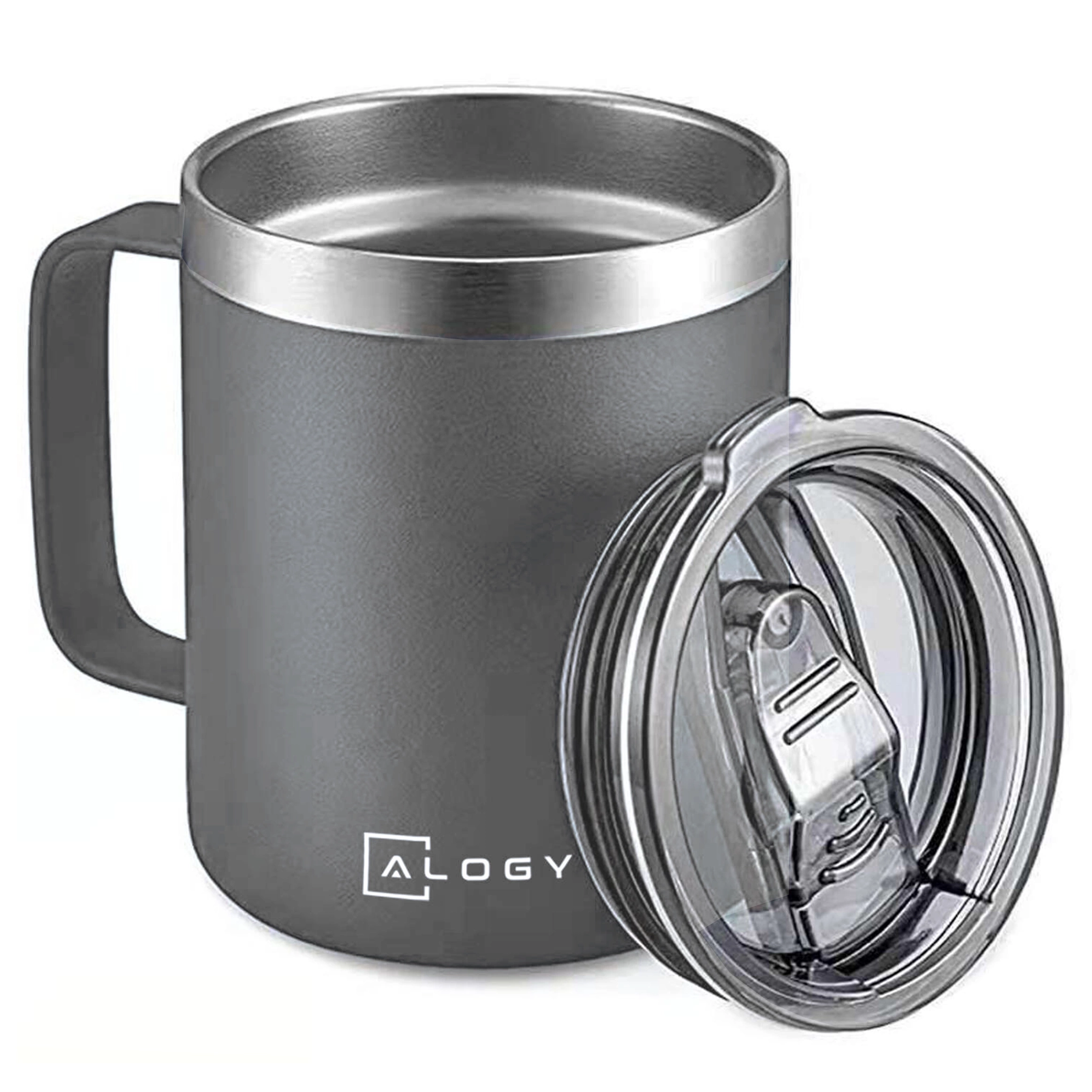 Opinie o Kubek termiczny 420ml z uchwytem pokrywką na kawę herbatę stalowy zimne i ciepłe napoje Alogy Szary + Szczotka do mycia