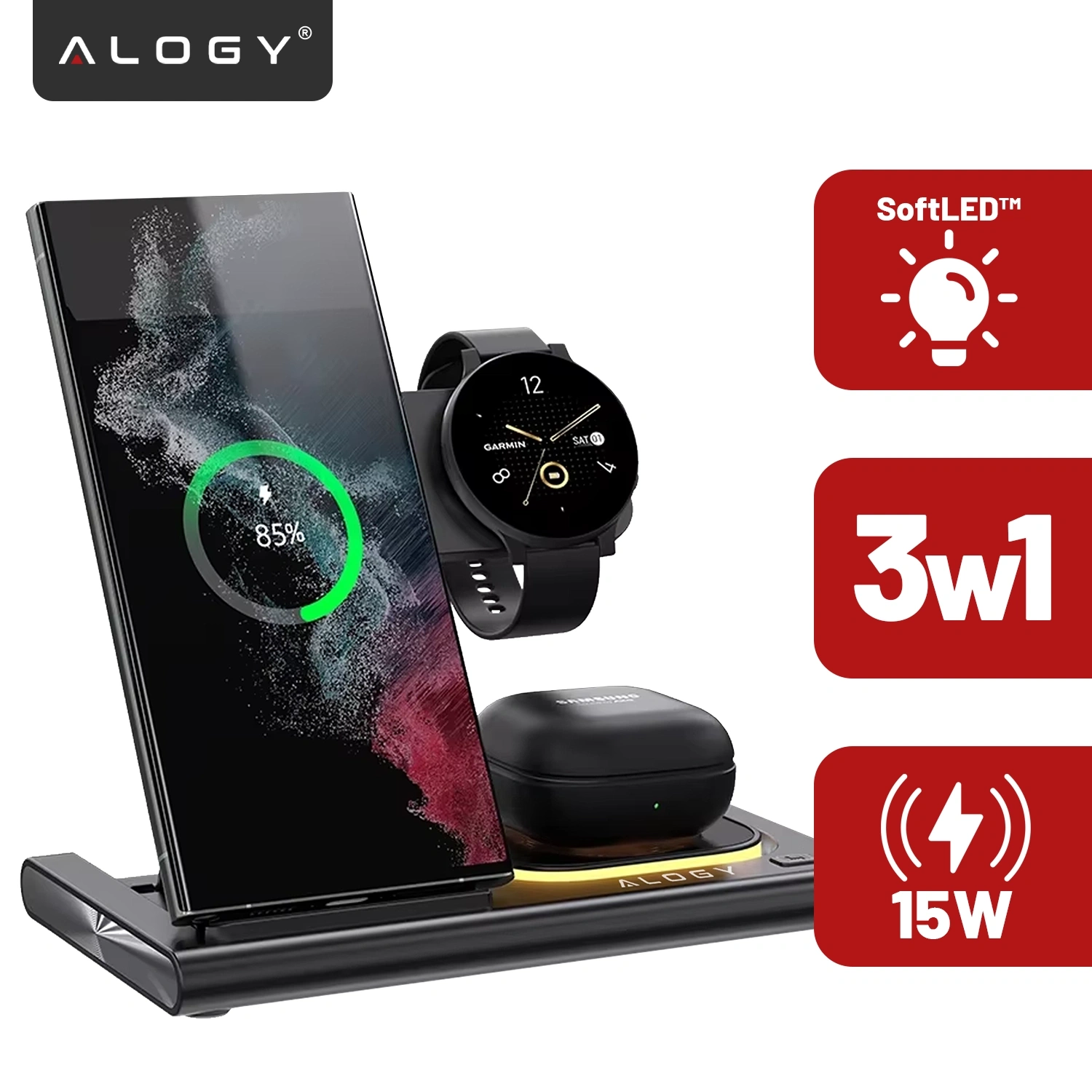 ▶️ Ładowarka indukcyjna Alogy 3w1 Qi 15W z lampką nocną - Ładuj 3 urządzenia jednocześnie