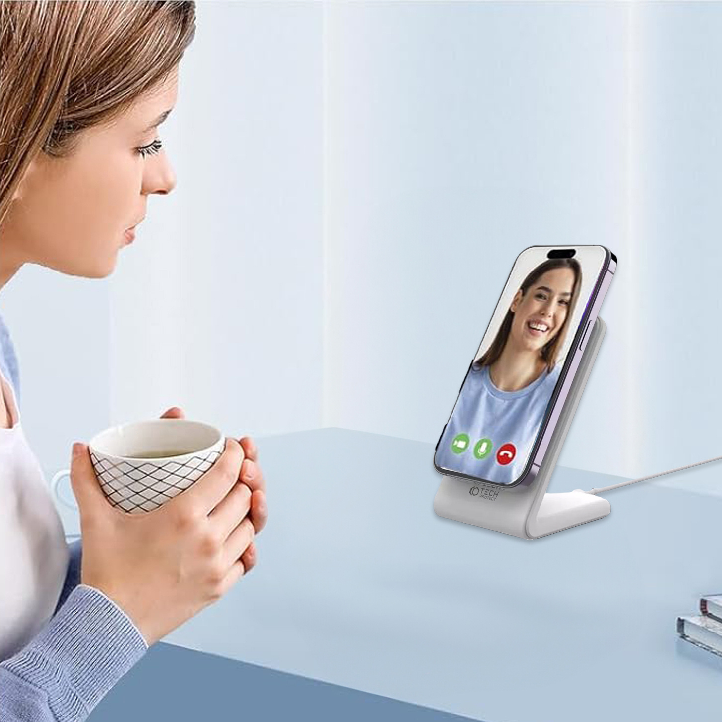 Dzięki mocowaniu magnetycznemu Mag Safe, ładowarka umożliwia elastyczne ładowanie iPhone'a w pionie i poziomie, co jest wygodne podczas oglądania treści lub prowadzenia rozmów bez utraty dostępu do zasilania. Można używać ładowarki jako stojaka.