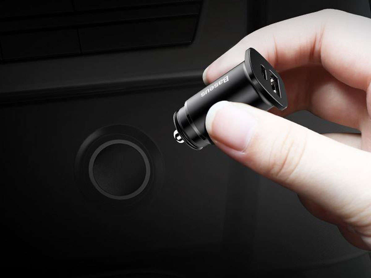 Ładowarka samochodowa firmy Baseus to kompaktowe urządzenie, które posiada wysoką moc ładowania. Wykonana została z najwyższej jakości aluminium oraz wyposażona jest w dwa uniwersalne porty: USB + USB-C Type-C, do których można podłączyć większość urządzeń mobilnych dostępnych na rynku, mi.in.: smartfon, nawigację czy urządzenie głośnomówiące.