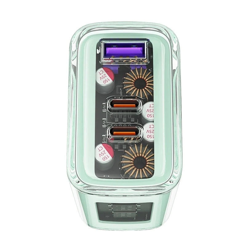 • Transparentny design: Ładowarka wyróżnia się unikalnym wyglądem przezroczystej obudowy, która umożliwia podziwianie wnętrza urządzenia, co dodaje jej nowoczesnego charakteru. Dodatkowo, solidny materiał PC zapewnia odporność na zarysowania, co zwiększa trwałość urządzenia.