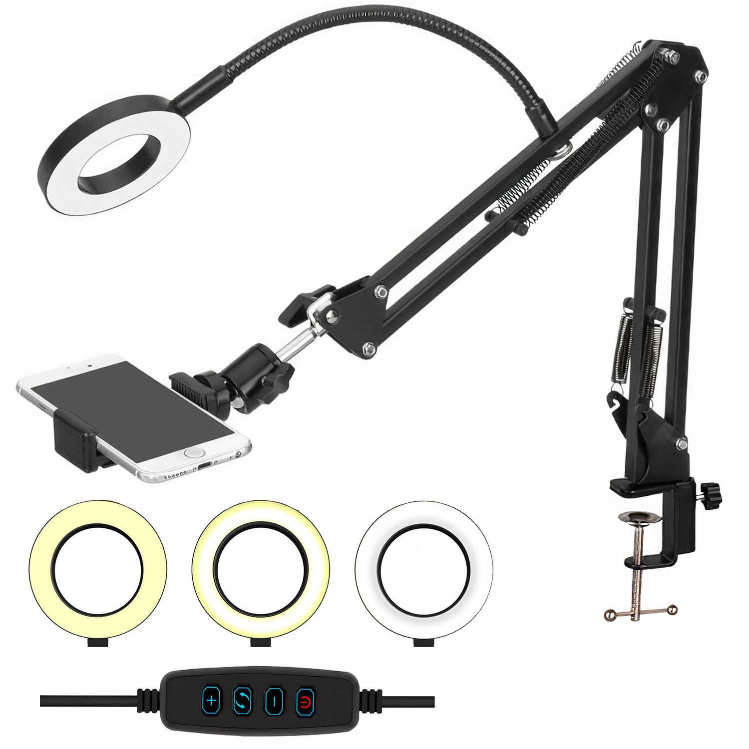 Opinie o Lampa kreślarska Ring LED Alogy z elastycznym ramieniem i statywem do blatu biurka uchwyt na telefon Czarna