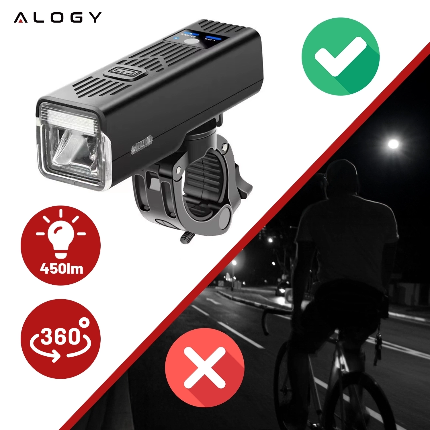 ▶️ Przednia lampka rowerowa LED Alogy 450lm USB-C zdalne sterowanie