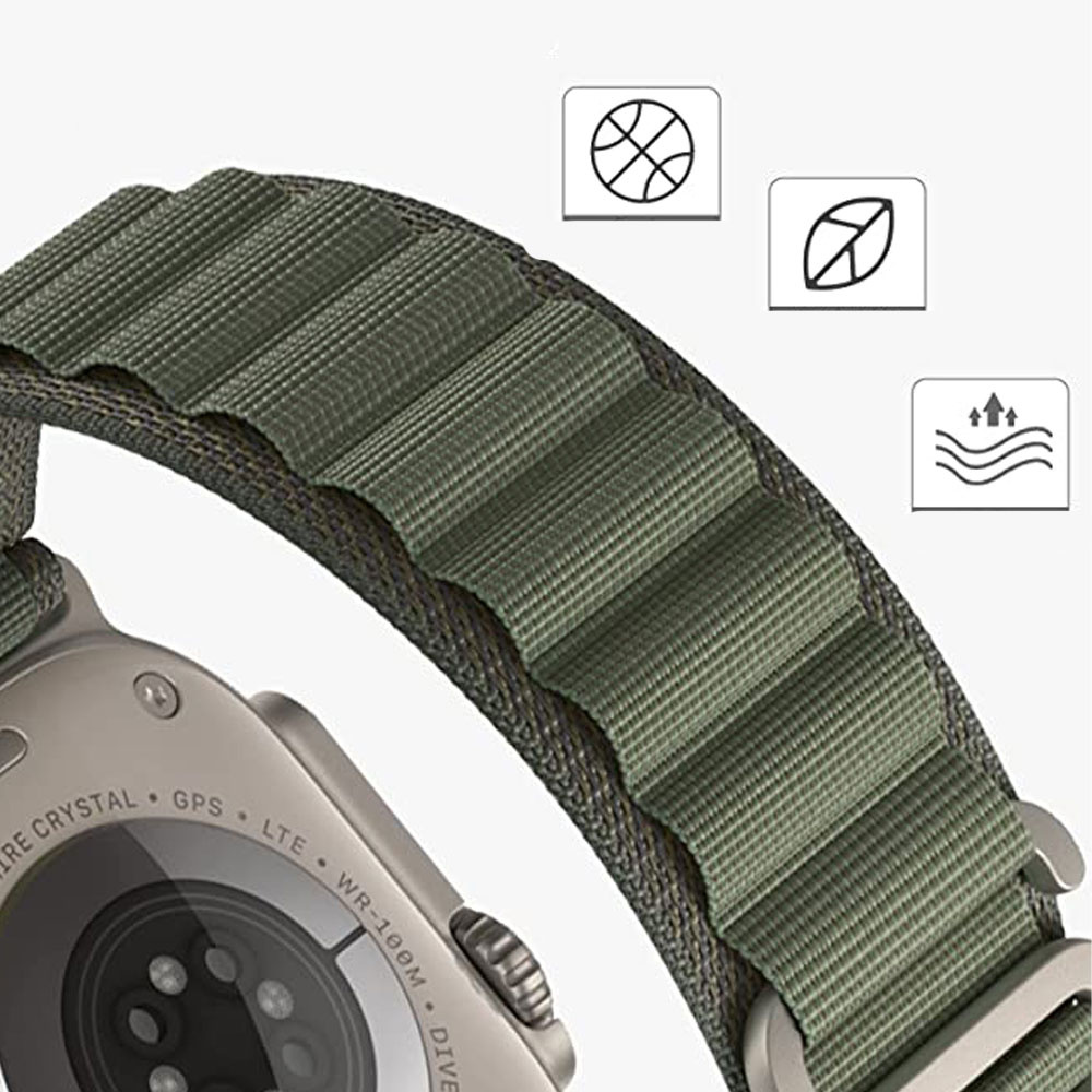 Nylonowy pasek firmy Alogy został idealnie dopasowany pod Apple Watch 1/2/3/4/5/6/7/8/SE (42/44/45/49mm).