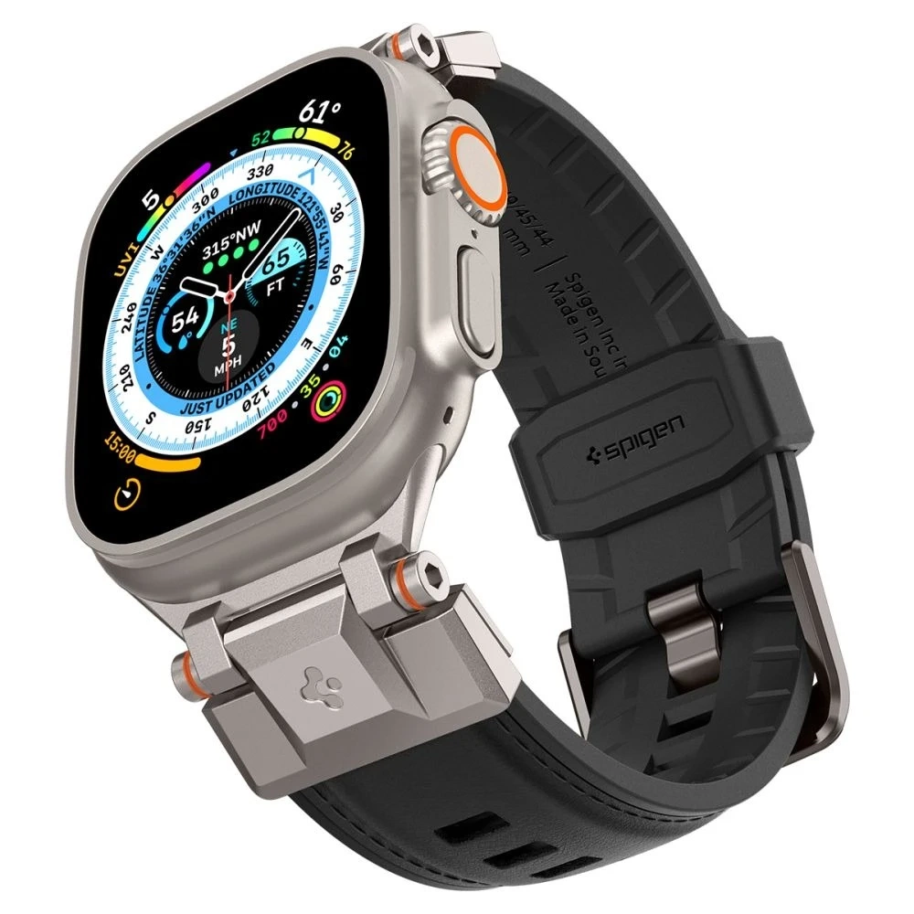 Odkryj niezwykłą kombinację stylu i wytrzymałości z paskiem DuraPro PU od Spigen. Ten pasek został stworzony z myślą o najwyższej jakości, łącząc unikalną, solidną konstrukcję z odważnymi metalowymi akcentami. Dopasowane kolorystycznie metalowe złącza doskonale komponują się z tytanową obudową Apple Watch Ultra, tworząc harmonijną i elegancką całość.