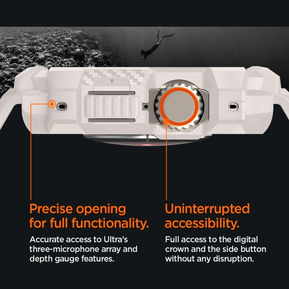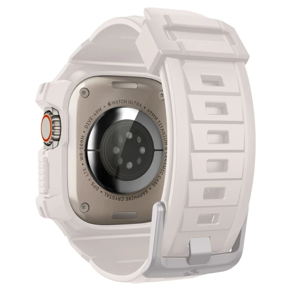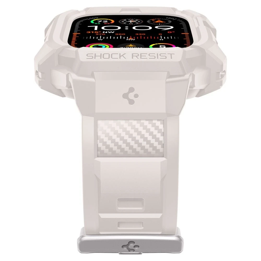 Wygodny pasek o sportowym zacięciu Spigen Rugged Armor Pro wykonany z elastycznego materiału TPU zdobionego akcentami z włókna węglowego. Posiada zintegrowaną obudowę z uwydatnionymi rantami, która pozwala na ochronę koperty zegarka przed zarysowaniami oraz uderzeniami. Pasek jest w pełni funkcjonalny i posiada możliwość regulacji według indywidualnych potrzeb.