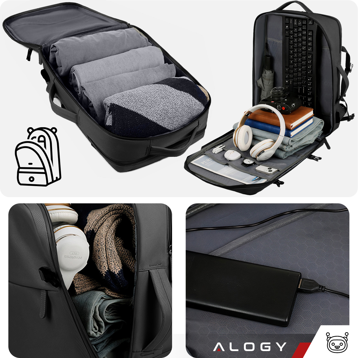 ✅ Główna komora plecaka - rozpinana jak walizka co pozwala przechowywać większe rzeczy takie jak ubrania. Posiada dodatkowo 7 przegródek (1x duża, 2x średnia, 2x mała, 2x najmniejsza), dzięki którym możemy posegregować wszystkie swoje rzeczy. Dodatkowo wewnątrz tej komory znajduje się kabel USB do podłączenia PowerBanka (brak PowerBanka w zestawie).