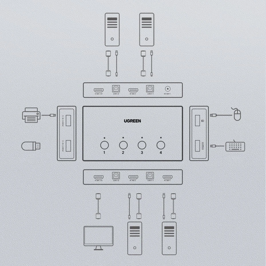 Funkcjonalny adapter posiada aż cztery wejścia HDMI i cztery USB – w tym dwa USB Typ A 1.1 i dwa USB Typ A 2.0. Daje więc możliwość podłączenia jednego urządzenia do czterech komputerów jednocześnie, np. myszki lub klawiatury, a nawet współdzielenia drukarki lub pendrive’a.