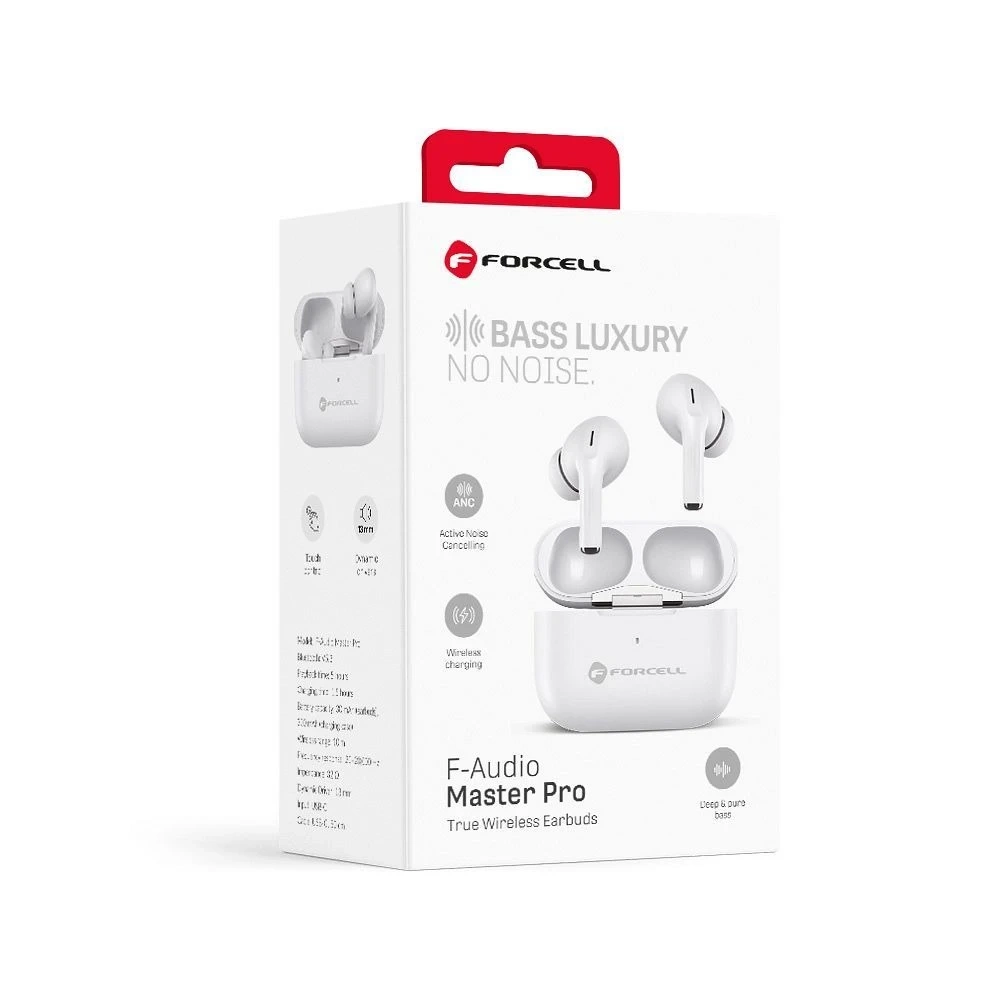 Słuchawki bezprzewodowe douszne Forcell F-Audio TWS Master Pro to nowoczesne urządzenie audio, które łączy stylowy design z zaawansowaną technologią. Dzięki aktywnej redukcji hałasu (ANC) możesz cieszyć się ulubioną muzyką, podcastami lub rozmowami bez zakłóceń z otoczenia – nawet w głośnym otoczeniu, takim jak samolot, biuro czy siłownia.