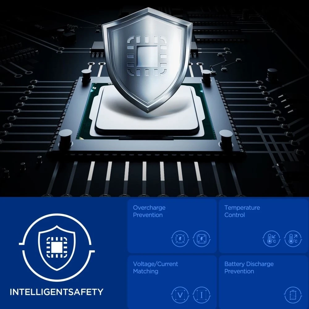 Technologia Quantum Boost™ automatycznie dostosowuje parametry ładowania do podłączonego sprzętu, zapewniając optymalną prędkość i pełne bezpieczeństwo. Zaawansowane zabezpieczenia chronią urządzenia przed przegrzaniem, przeładowaniem, zbyt wysokim napięciem oraz nadmiernym rozładowaniem, gwarantując stabilność i długą żywotność power banku.