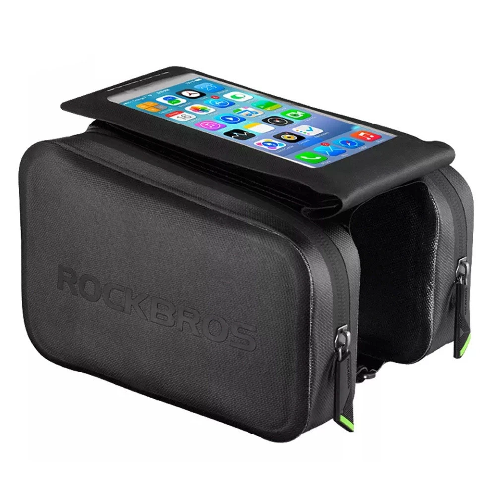 Torba rowerowa / uchwyt rowerowy Rockbros AS-006BK (czarny) Rockbros AS-006BK składa się z dwóch kieszeni i posiada dedykowane etui na telefon. Torba jest w pełni odporna na wodę, dzięki czemu masz pewność, że Twoje akcesoria nie zostaną uszkodzone. Została wyposażona w szczelne zamki, a jej waga wynosi około 246 g. Ponadto pasuje do smartfonów, których przekątna ekranu nie przekracza 6”. Dzięki dużej pojemności zmieścisz w niej na przykład pompkę rowerową, kabel ładowania, dokumenty, portfel czy narzędzia, które przydadzą się podczas ewentualnej usterki roweru.
