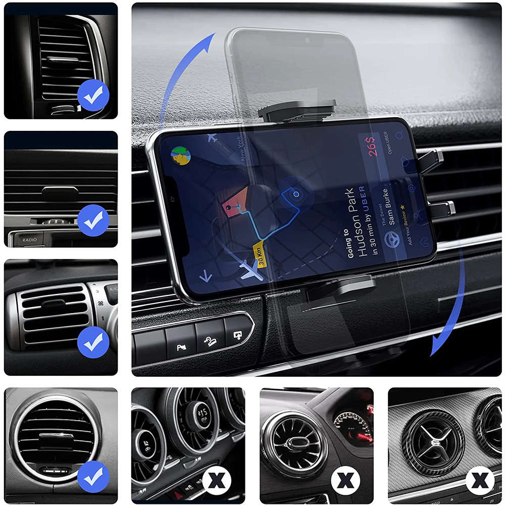 Uchwyt możemy zainstalować w prosty sposób na szybkie, desce rozdzielczej lub kratce wentylacyjnej samochodu. Do zestawu dołączono uchwyt do montażu na kratce wentylacyjnej dla lepszego komfortu użytkowania.