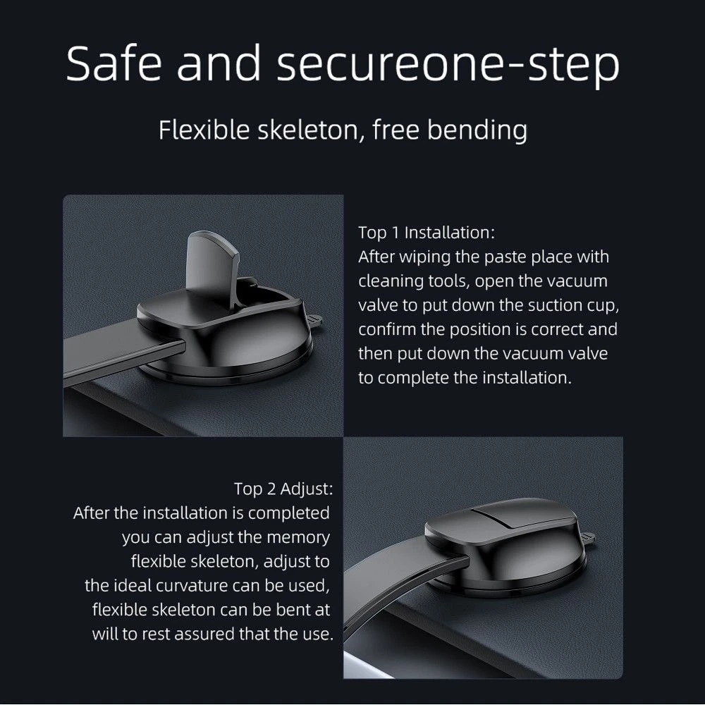W zależności od preferencji możesz zamocować uchwyt na szybie lub desce rozdzielczej. Uniwersalne mocowanie zapewnia solidne trzymanie i wygodną obsługę telefonu niezależnie od wybranego miejsca.