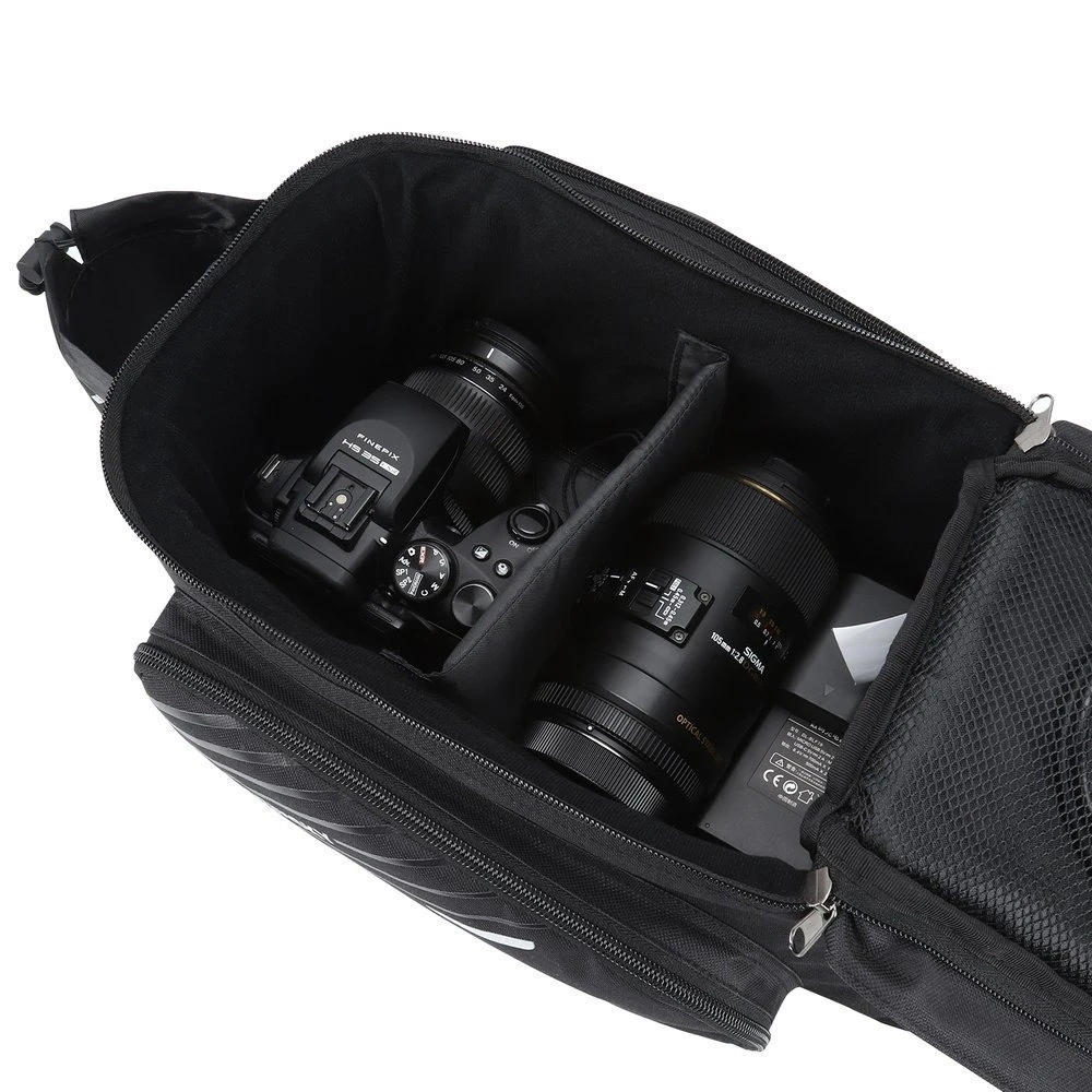- Zadba o odpowiednią organizację przewożonych rzeczy. Torba na bagażnik została wyposażona w kieszenie, wewnętrzne przegródki i plecionkę z elastycznej gumy